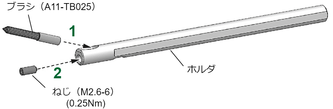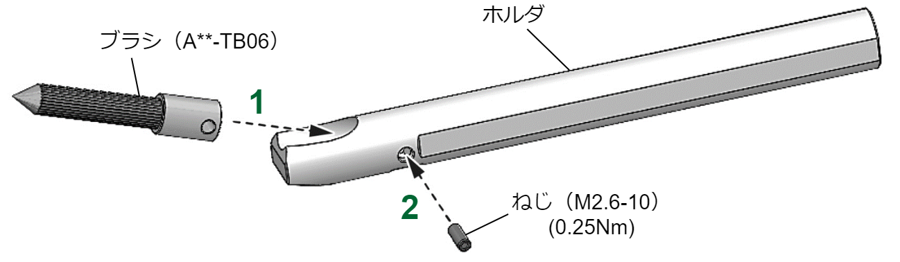 組立方法 TM-SH-06 ホルダにブラシ(A11-TB025)を挿入します。 ホルダ先端の穴にねじ(M2.6-6)を挿入し、六角レンチを使ってトルク0.25Nmで締付けて固定します。 TM-SH-12 ホルダにブラシ(A**-TB06)を挿入します。 ホルダ横の穴にねじ(M2.6-10)を挿入し、六角レンチを使ってトルク0.25Nmで締付けて固定します。